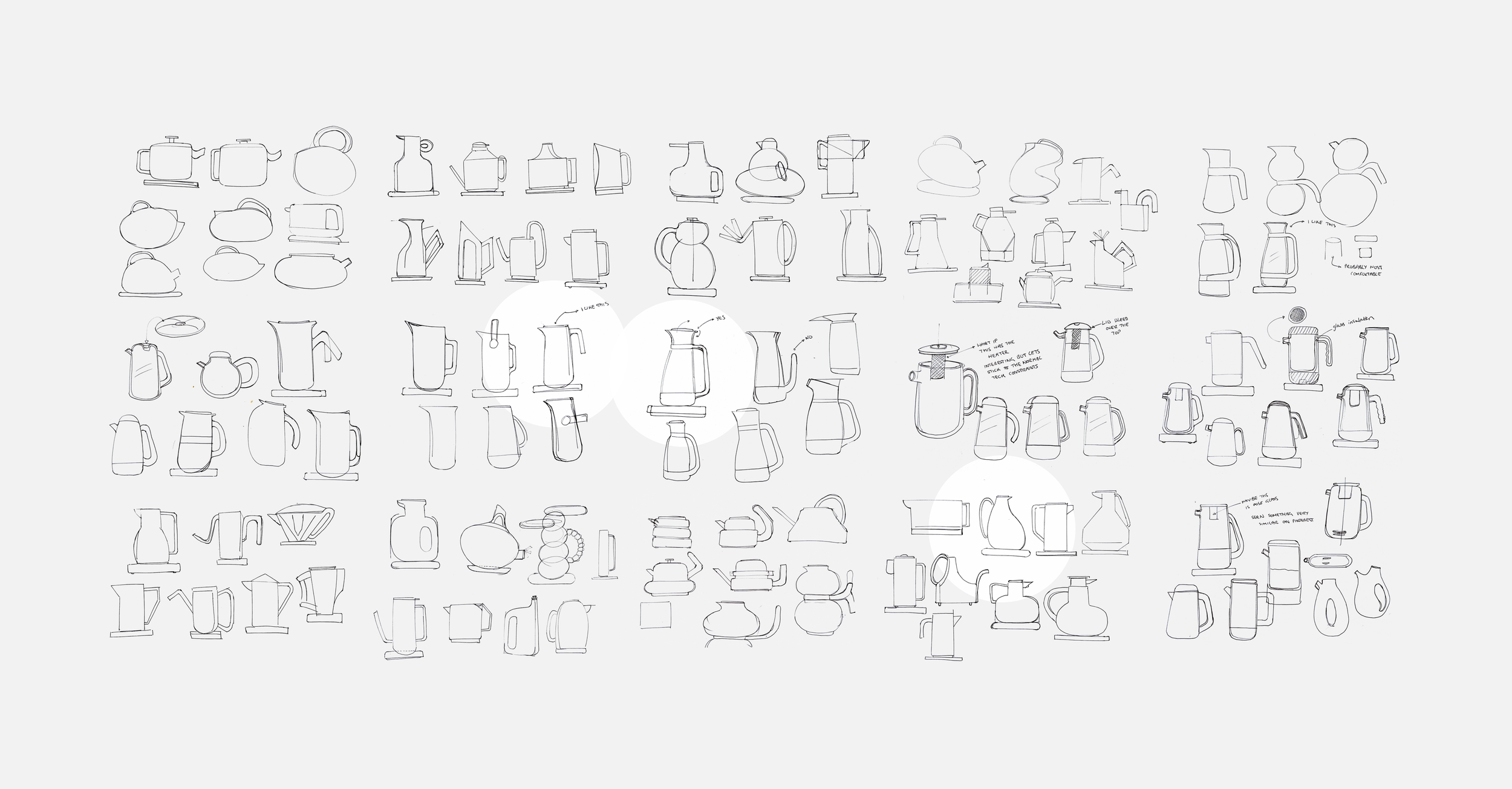 Exploring Ideas: I treated this task as a 2D exercise in the beginning stages. The majority of these sketches are from a side profile, which was deliberate, as I felt this was the most important angle of the kettle to get right, in term of aesthetics, because it’s the angle most people rest their kettle in their kitchen. The process I used to generate these sketches was simply to draw as many different shapes as I could think of without looking at any reference imagery. During my sketching sessions, I became really interested in this idea of a sharp transition of surface between the pouring session and the lid of the kettle.