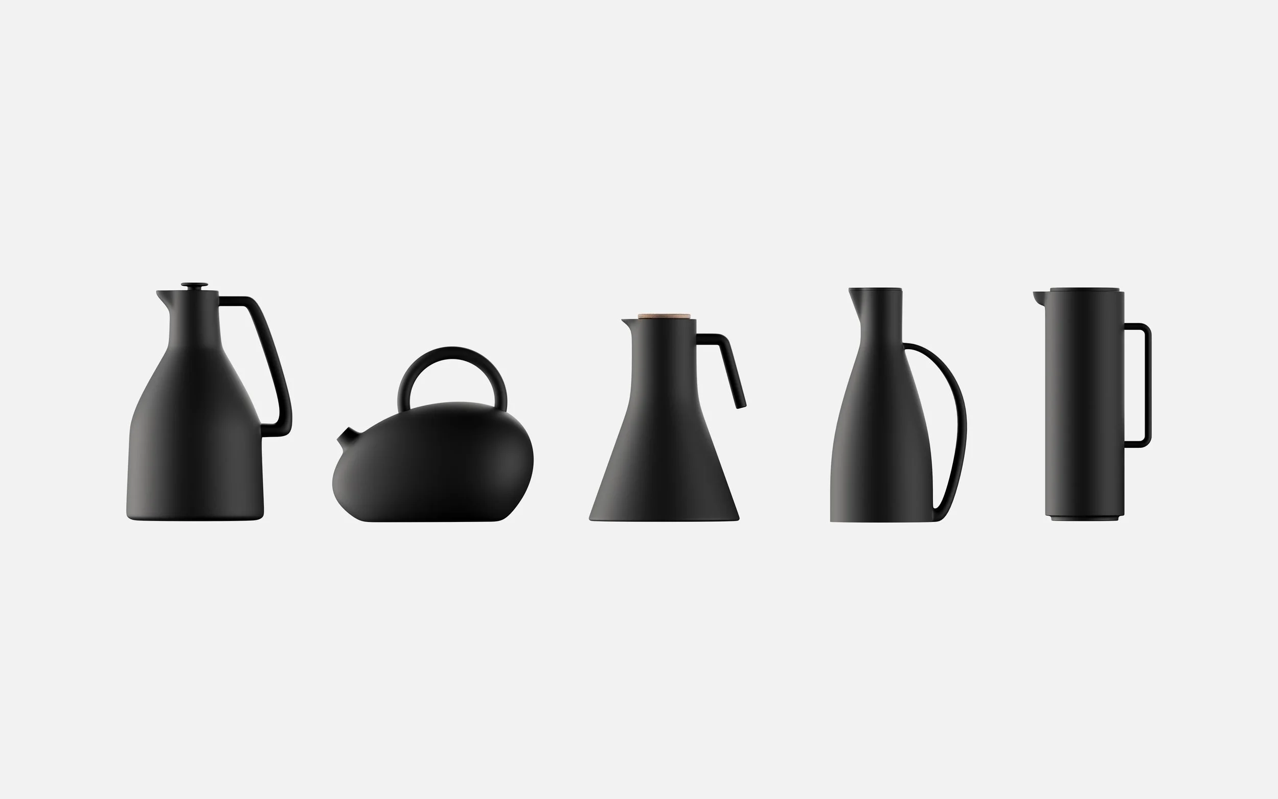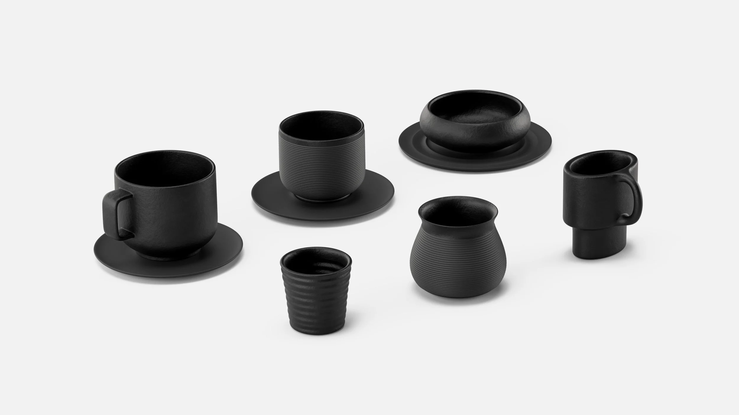Key Themes: Japanese Tetsubin Tea Pots, Cast Iron, Hinoki Wood Interiors, Pampas Grass, Curvilinear Forms, Sculpture, Ritual, Coarse Texture, Black