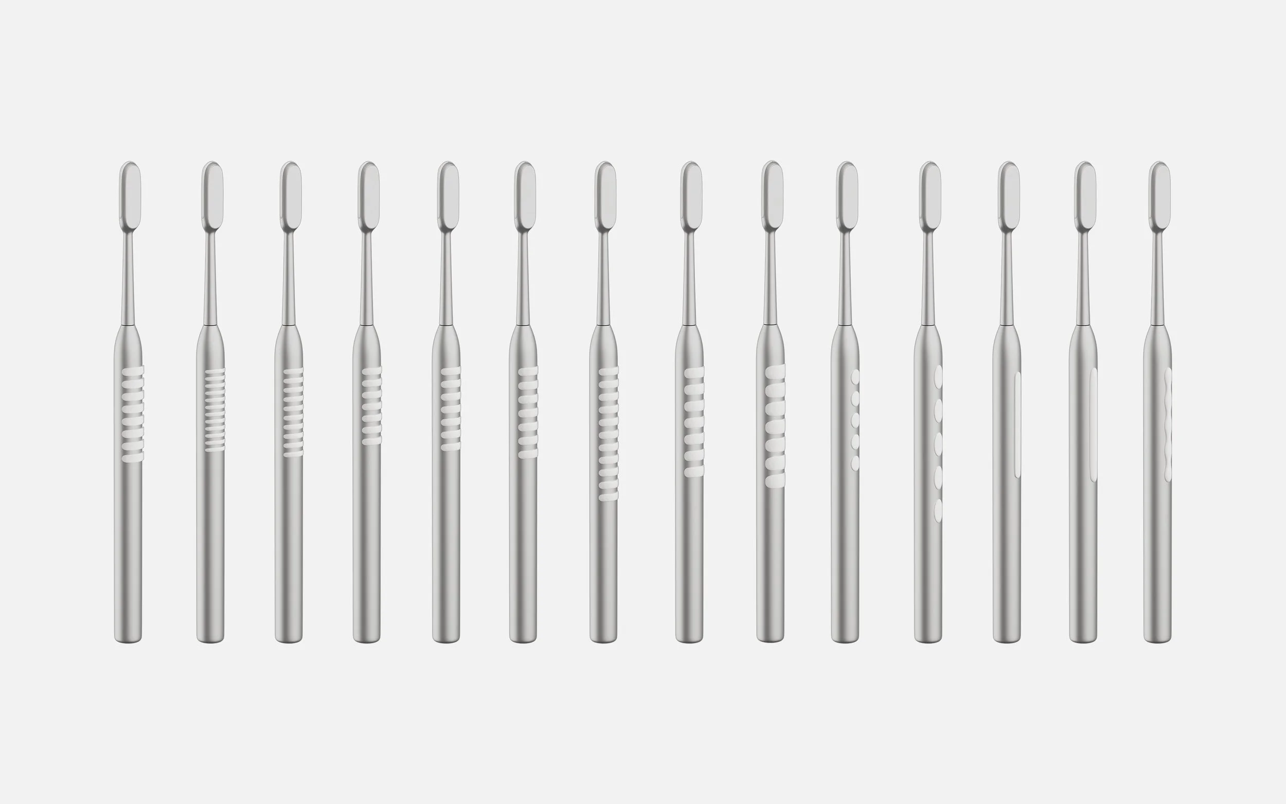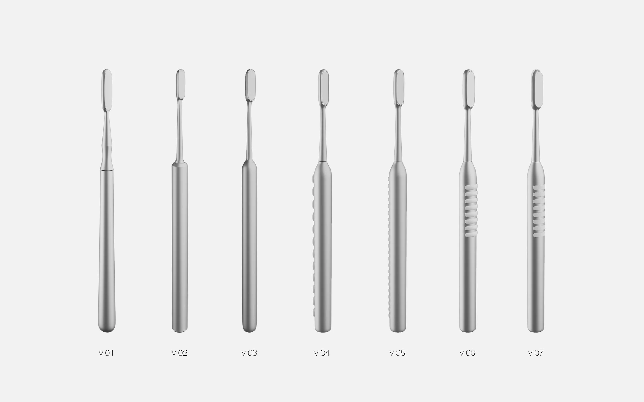 Material Efficiency: Looking back, I would of loved to have 3D printed these designs to decide which grip felt right. At the time however, my reasoning to chose the pill shaped grip was that it would mean less material used, therefore reduce overall manufacturing complexity. I also felt it complimented the pill shape of the protective padding on the brush head.