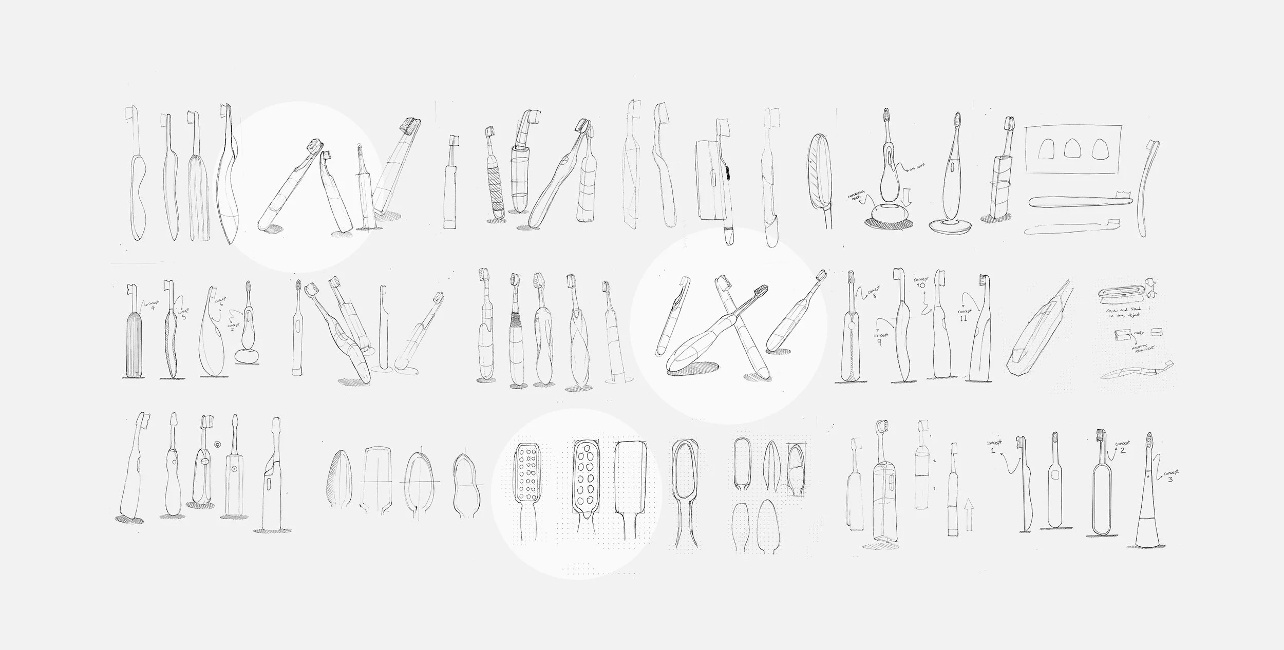 Cylindrical and Organic Shapes: During the initial sketching phase, I explored a range of forms with little constraints. As toothbrushes predominantly have a cylindrical form, I wanted to explore some curvilinear shapes to see if they had any promise.