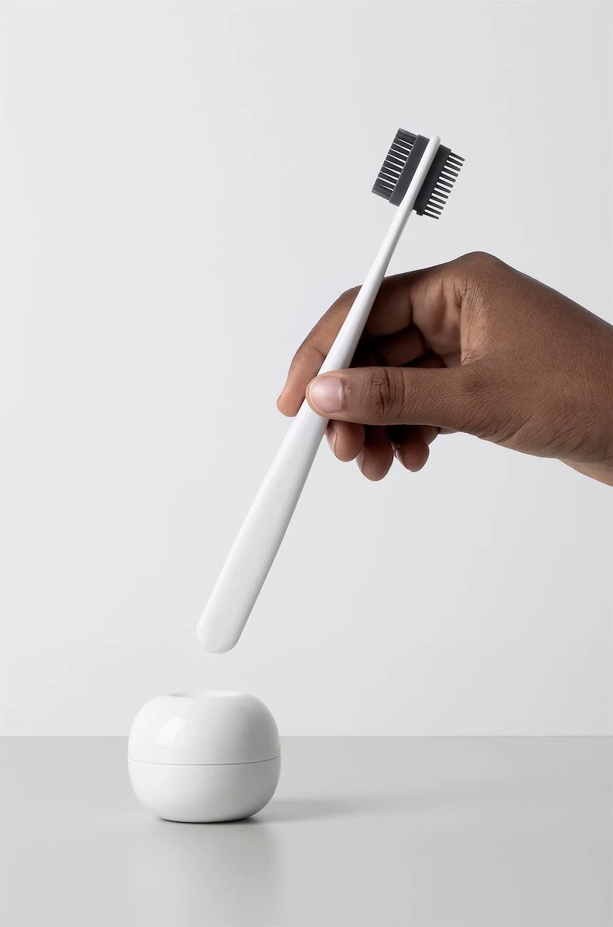 Diatomaceous Earth: The toothbrush stand is designed to improve bristle hygiene. The problem is water creates the ideal conditions for bacteria to grow. This stand is made from diatomaceous earth which both antimicrobial and water absorbent. It encourages people to rest their toothbrush horizontally which prevent water flowing down the handle and helps to dry the bristles.