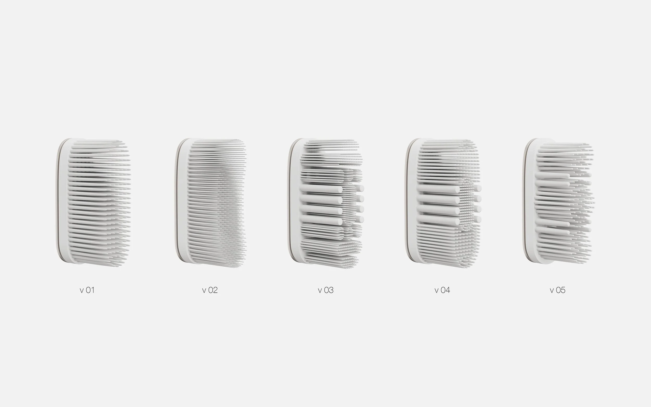 Ergonomics: The bristles were designed to give the best cleaning experience. V05 has a zig zag side profile which allows the bristles to wrap around each tooth and cover as much area as possible. Moreover, the bristles for v05 are arranged in a concentric pattern, which enables a high bristle density whilst still respecting the limitations of injection moulding.